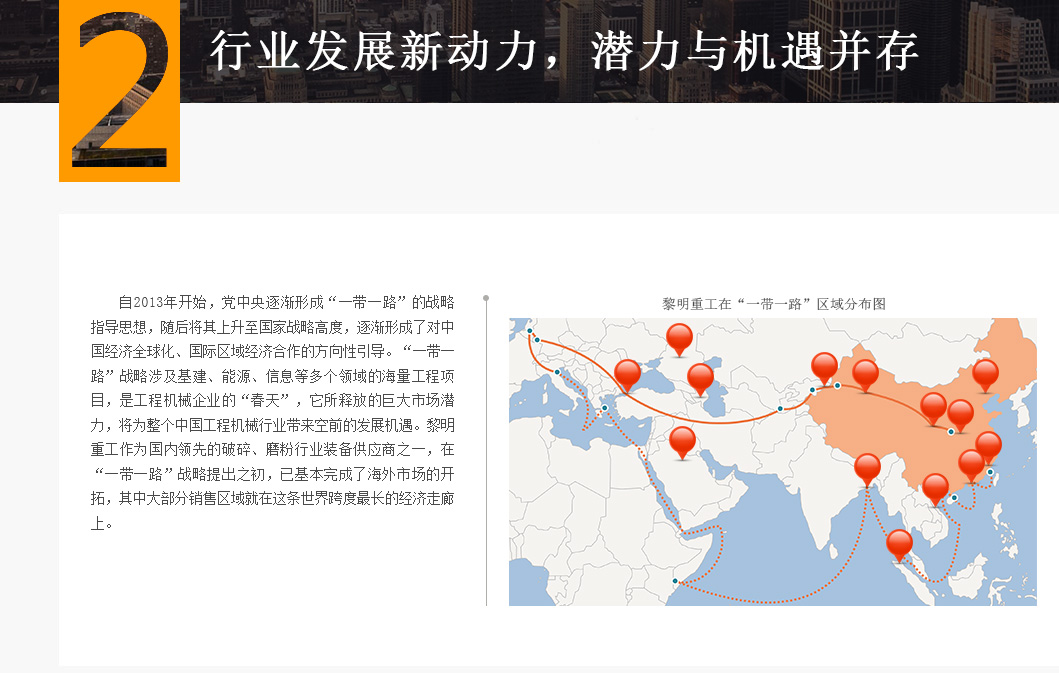自2013年开始,党中央逐渐形成“一带一路倡议”的战略指导思想,随后将其上升至国家战略高度,逐渐形成了对中国经济全球化,国际区域经济合作的方向性引导,“一带一路倡议”战略涉及基建,能源,信息等多个领域的海量工程项目,是工程机械企业的“春天”,它所释放的巨大市场潜力,将为整个中国工程机械行业带来发展机遇,黎明重工作为国内知名的破碎,磨粉行业装备供应商之一,在“一带一路倡议”战略提出之初 91影院,已基本完成了海外市场的开拓,其中大部分销售区域就在这条世界跨度最长的经济走廊上。
