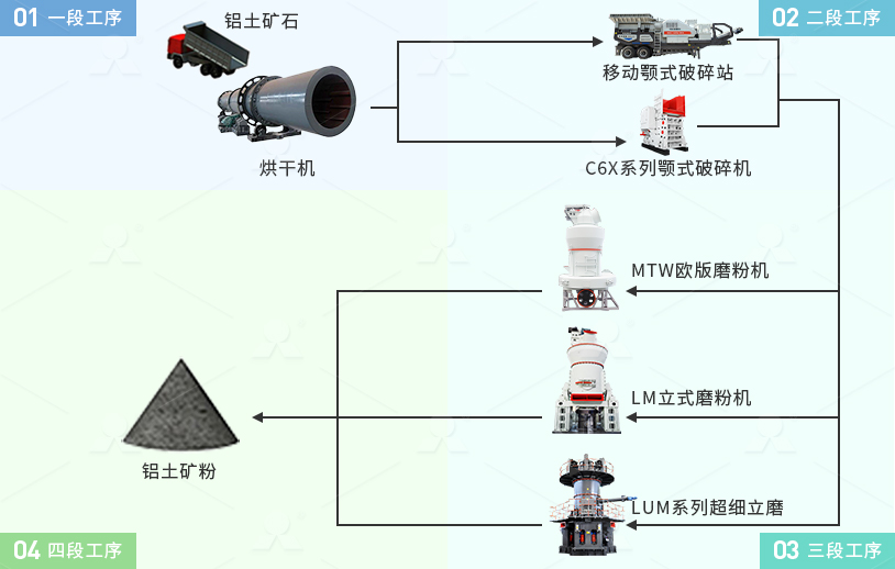 铝土矿石加工生产工艺主要包括:煅烧,破碎,粉磨 91在线,成品包装四个阶段。