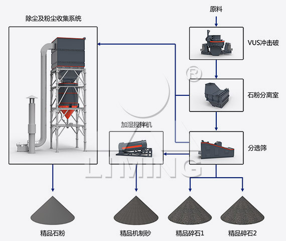原料通过斗提机被送入顶楼,由原料输送皮带将0~40mm的碎石送入VUS冲击破,经过高频石打石研磨后进入石粉分离室,通过调整控粉箱进风口大小和系统风量来调节制砂含粉量,处理后的物料进入分选筛内分选出精品碎石,石粉及准成品砂,其中石粉通过除尘及粉尘收集系统处理后收集为精品石粉,准成品砂通过加湿搅拌机均匀拌合后即为精品机制砂,经VUS砂石同出系统处理后 91影院观看,能够产出级配合理,粒型圆润,含粉量可控的精品粗细骨料(碎石,机制砂),以及干燥洁净,可进行统一回收利用的高附加值石粉(根据原料决定可应用范围)。