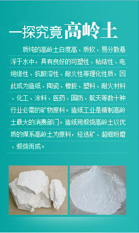 质纯的高岭土白度高、质软、易分散悬浮于水中,具有良好的可塑性、粘结性、电绝缘性、抗酸溶性、耐火性等理化性质,因此成为造纸、陶瓷、橡胶、塑料、耐火材料、化工、涂料、医药、国防、航天等数十种行业的矿物原料。造纸工业是精制高岭土大的消费部门。造纸用煅烧高岭土以品质良好的煤系高岭土为原料,经选矿、超细粉磨、煅烧而成。